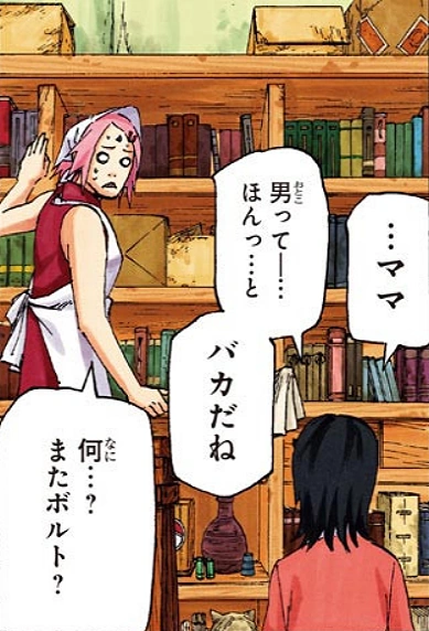 Depois de Boruto pedir a seus colegas para se juntarem a ele em uma brincadeira, nenhum deles se juntam a ele, mas Sarada o segue e o observa de longe, mantendo-se escondida atrás dele. Mais tarde, quando ela chega em casa, ela diz a sua mãe que os meninos são estúpidos, mas observa que Boruto e ela possuem algumas coisas em comum, como os seus desejos semelhantes em relação aos seus pais. Naruto Gaiden: O Sétimo Hokage e o Mês da Primavera Escarlate